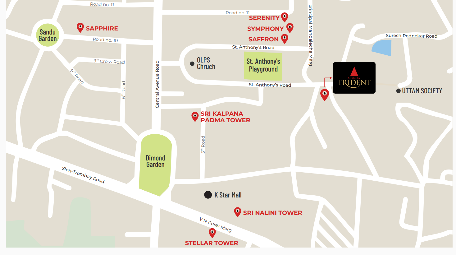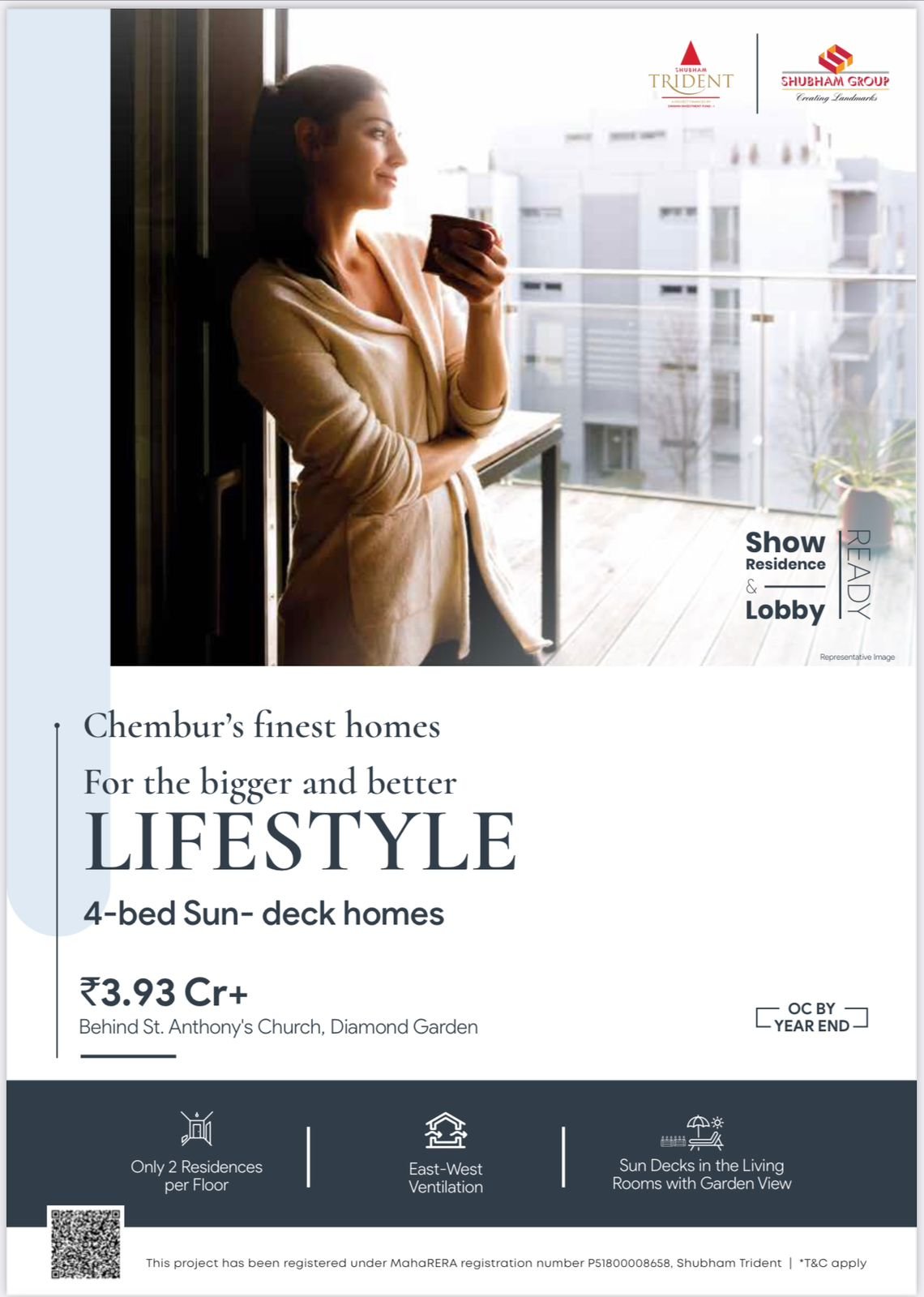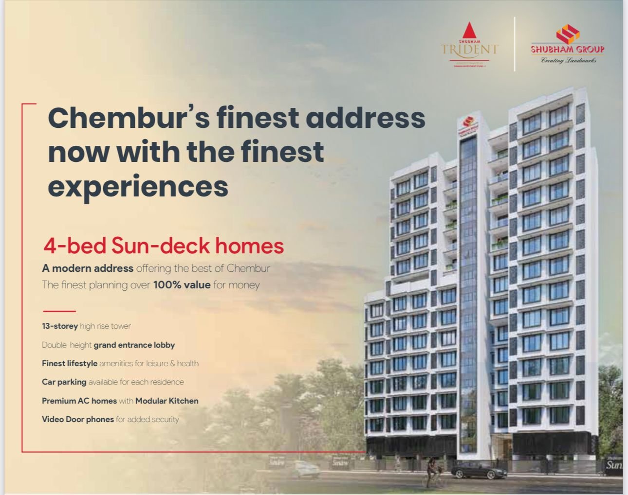 Shubham Trident is a Residential Project Developed by the Shubham Groups. It is located at Chembur. Chembur is well-connected to other parts of Mumbai and the metropolitan area through road and rail networks. The Eastern Express Highway and the Eastern Freeway provide easy access to South Mumbai and other parts of the city. 1.3 - 1.5 km distance to Chembur Railway Station and Monorail Station. Connectivity to major commercial hubs like BKC, Powai, Vashi and lower Parel. Close proximity to the social infrastructure. It is a 13 storey tower offering 2 and 3 BHK Ac homes. Cross Air Ventilation. Modular Kitchen and Premium Vitrified Flooring. Select 4 bed AC homes with sun-deck. Car parking available for each residence. Double-height grand entrance lobby and Finest lifestyle amenities for leisure & health.